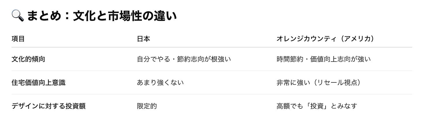 日本では美意識や機能性重視であることに対してアメリカではタイムマネジメント(自分の)や資産価値向上のための投資目的の意識が強いということ。