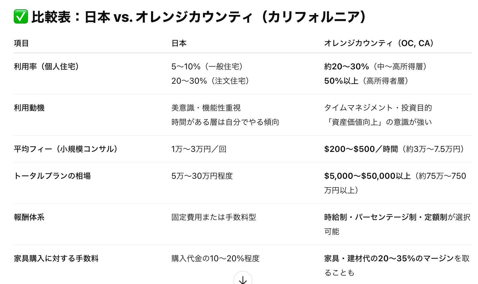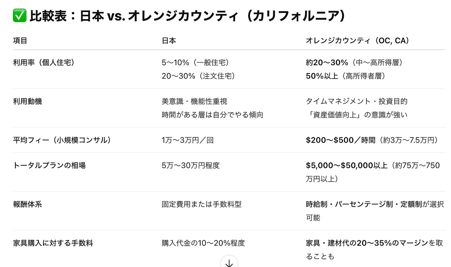 そこで私の住むエリアを基本に比較をしてみました。この辺りの傾向は私も理解しているのでアメリカ、特にカリフォルニア州オレンジカウンティと日本のインテリアデザイン市場を比較すると、文化・価格帯・利用率に大きな差があることがわかりました。