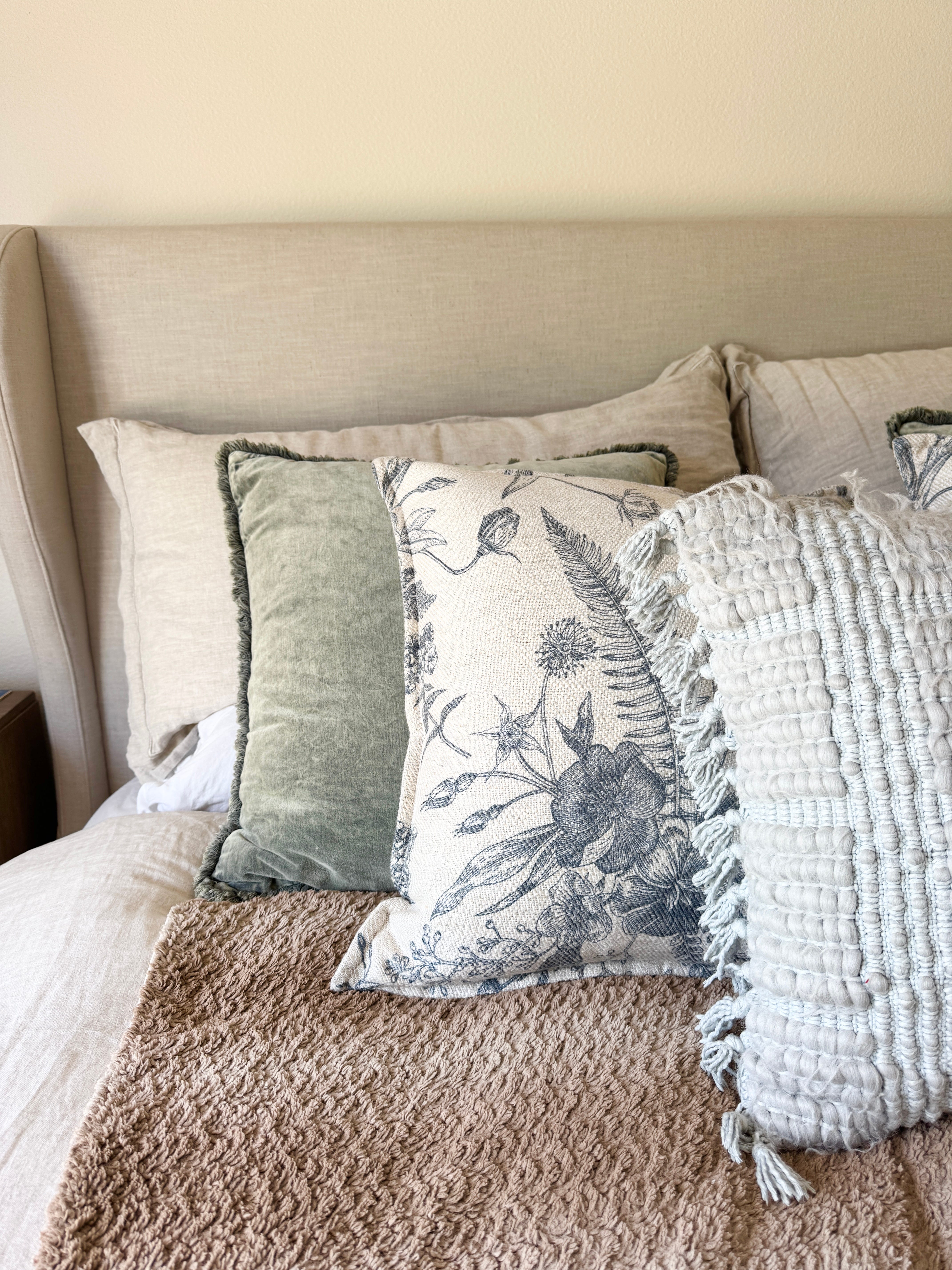 麻、ベルベッド、コットン、毛糸。でも雰囲気はまとまっていると思うんです。私はベッドに沢山の花柄を持ってくるのは主人もいるのでどうかな、といつも感じていましたがこれくらいの花柄でしかも無機質な色なのであえていい感じが出せるだろうと思ったら、思った通りでした!笑