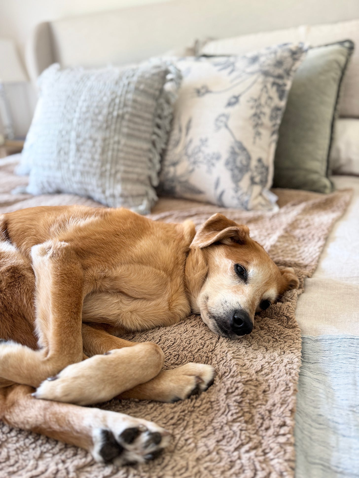 いつもこの子の寝場所になってしまうので彼女用に茶系の小さなブランケットを置いて汚れ防止にしています。