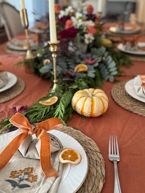Noteやインスタでもシェアしましたがオレンジのテーブルクロスに合うナプキンを探していてパーフェクトなオーガニックコットンのものを最近見つけて買ったばかり。これをベルベットのリボンで飾ることにしました。